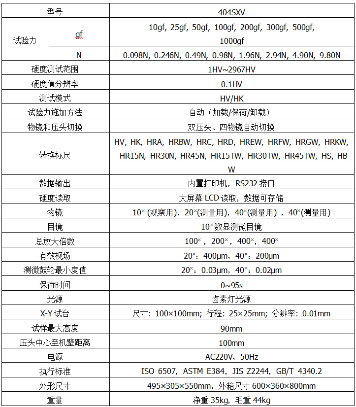 404SXV數(shù)顯顯微維氏努氏硬度計(jì)是光、機(jī)、電一體化的高新技術(shù)產(chǎn)品,它造型新穎、美觀,內(nèi)部結(jié)構(gòu)多用不銹鋼零件組成,性能更佳。采用新型自動(dòng)轉(zhuǎn)塔機(jī)構(gòu),同時(shí)裝置顯微維氏和努氏測量的兩個(gè)壓頭。在大屏幕上能更加直觀地顯示試驗(yàn)方法、試驗(yàn)力、壓痕長度、保荷時(shí)間、測量次數(shù)、轉(zhuǎn)換標(biāo)尺、日期時(shí)間,操作時(shí)只要測量壓痕按目鏡按鈕,即可自動(dòng)計(jì)算出硬度值并顯示在屏幕上。數(shù)據(jù)測量具有上下限報(bào)警功能,結(jié)果可以保存通過表格查看,也可通過內(nèi)置打印機(jī)輸出,并配有RS232接口供用戶連接電腦輸出�?蛇x配LCD視屏測量裝置和CCD圖像自動(dòng)測量系統(tǒng)。