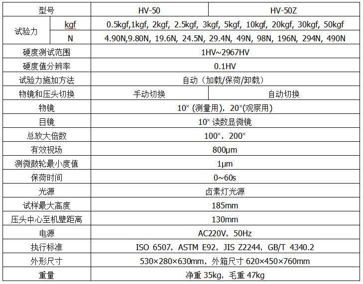 HV-50 / HV-50Z維氏硬度計(jì)是光、機(jī)、電一體化的高新技術(shù)產(chǎn)品,儀器采用閉環(huán)式加載控制系統(tǒng),使試驗(yàn)力精度提高,示值的重復(fù)性及穩(wěn)定性佳。在屏幕上能顯示試驗(yàn)力、保荷時(shí)間、測(cè)量次數(shù),操作時(shí)只要從鍵盤輸入壓痕對(duì)角線長(zhǎng)度,即可自動(dòng)計(jì)算出硬度值并顯示在屏幕上�?蛇x配CCD圖像自動(dòng)測(cè)量系統(tǒng)。