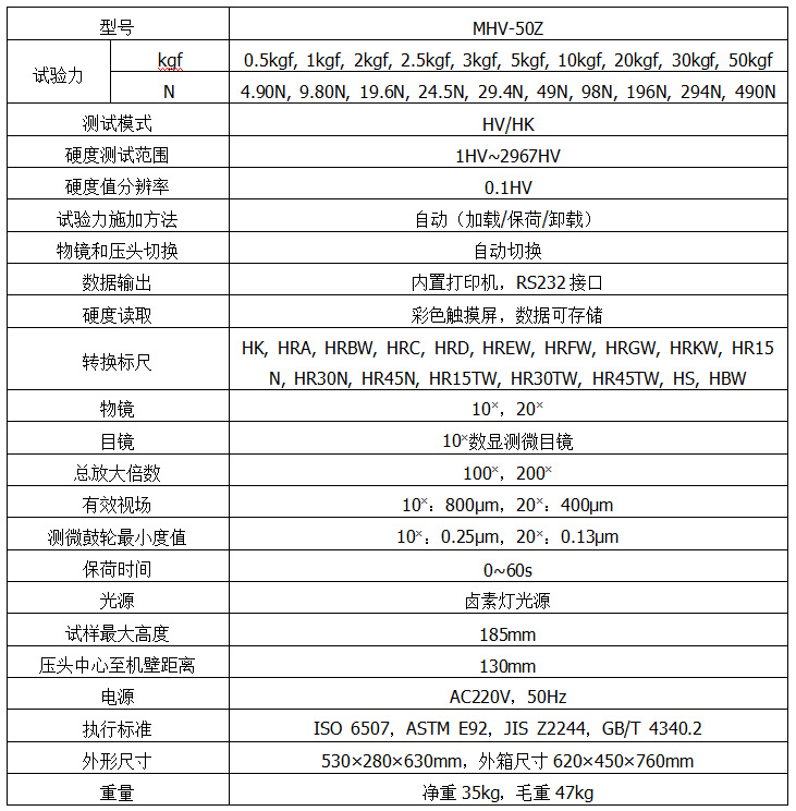 MHV-50Z數(shù)顯維氏硬度計(jì)是光、機(jī)、電一體化的高新技術(shù)產(chǎn)品,采用閉環(huán)式加載控制系統(tǒng),試驗(yàn)力精度高,示值的重復(fù)性及穩(wěn)定性佳。該儀器采用全新的高分辨率彩色觸摸屏,顯示直觀清晰,操作方便,顯示屏背光可調(diào)、具備節(jié)能模式。配備數(shù)顯測(cè)微目鏡,不用查表,也不用輸入壓痕對(duì)角線(xiàn),在觸摸屏上直觀地顯示試驗(yàn)力、壓痕長(zhǎng)度、保荷時(shí)間、測(cè)量次數(shù)、轉(zhuǎn)換標(biāo)尺、日期時(shí)間,操作時(shí)只要測(cè)量壓痕按目鏡按鈕,即可自動(dòng)計(jì)算出硬度值并顯示在屏幕上。硬度測(cè)試結(jié)果實(shí)時(shí)保存,任意數(shù)據(jù)可選刪除及打印輸出,自動(dòng)計(jì)算最大、最小、平均值;并配有RS232接口供用戶(hù)連接電腦輸出。可選配LCD視屏測(cè)量裝置和CCD圖像自動(dòng)測(cè)量系統(tǒng)。