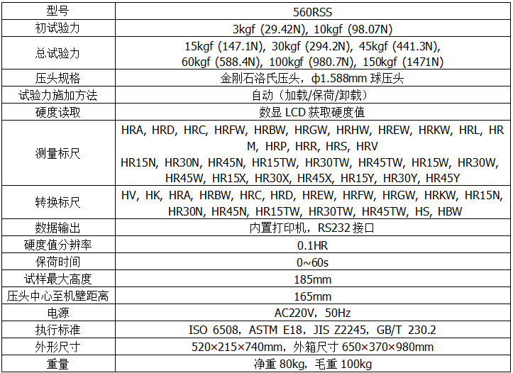 560RSS數(shù)顯雙洛氏硬度計外形新穎、功能齊全、操作方便、顯示清晰直觀、性能穩(wěn)定,是集機(jī)電于一體的高新技術(shù)產(chǎn)品,可進(jìn)行洛氏、表面洛氏全部標(biāo)尺的硬度測試�?娠@示和設(shè)置當(dāng)前測試標(biāo)尺、試驗力、測試壓頭、保荷時間、硬度轉(zhuǎn)換值、壓頭類型等,其主要功能如下:洛氏、表面洛氏硬度標(biāo)尺的選擇;各硬度標(biāo)尺之間的換算值;硬度測試結(jié)果可保存查看及打印輸出,自動計算最大、最小、平均值;配有RS232接口供用戶連接電腦輸出。