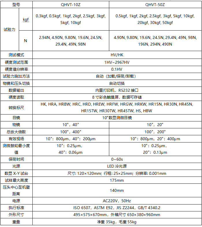 QHVT-10Z/50Z數顯維氏硬度計采用全新鋁合金壓鑄工藝,殼體堅固穩(wěn)定,新穎美觀。采用閉環(huán)式加載控制系統(tǒng),并且通過電機直驅式垂直加載試驗力,試驗力精度更高更穩(wěn)定。轉塔速度更快,測試效率高。采用特殊材質升降軸,滾珠絲杠結構,升降更平穩(wěn)。儀器采用全新8寸大屏彩色觸摸屏,顯示直觀清晰,角度任意調節(jié),操作方便。配備數顯測微目鏡,不用查表,也不用輸入壓痕對角線,在觸摸屏上直觀地顯示試驗力、壓痕長度、保荷時間、轉換標尺、時間等,操作時只要測量壓痕按目鏡按鈕,即可自動計算出硬度值并顯示在屏幕上。硬度測試結果實時保存,數據分類、可選刪除及打印輸出,自動計算最大、最小、平均值;并配有RS232接口供用戶連接電腦輸出�?蛇x配LCD視屏測量裝置和CCD圖像自動測量系統(tǒng)。