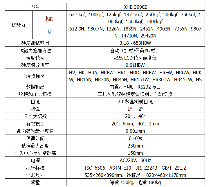 XHB-3000Z三壓頭數(shù)顯布氏硬度計采用精密的結(jié)構(gòu)設(shè)計,試驗力施加由力傳感器直接控制,使整機(jī)結(jié)構(gòu)緊湊,加卸試驗力平穩(wěn)、準(zhǔn)確。在電氣上由CPU控制試驗過程,物鏡和壓頭間采用自動切換,切換定位采用機(jī)械與電子雙重配合,使定位精度更高。本儀器具備10級試驗力,13種布氏硬度的測試標(biāo)尺,可任意選擇;具備了三個壓頭和兩個物鏡,都能自動參與測試,物鏡和壓頭間默認(rèn)識別、自動切換;可預(yù)置試驗力保持時間、調(diào)節(jié)測量壓痕光源的強(qiáng)弱;顯示測量壓痕長度、硬度值、測量次數(shù)等;具備硬度標(biāo)尺轉(zhuǎn)換功能;數(shù)據(jù)結(jié)果可以保存并通過表格查看,也可通過內(nèi)置打印機(jī)輸出,并配有RS232接口供用戶連接電腦輸出。硬度計還可根據(jù)用戶特殊需求配置視屏測量裝置和CCD圖像自動測量系統(tǒng)。