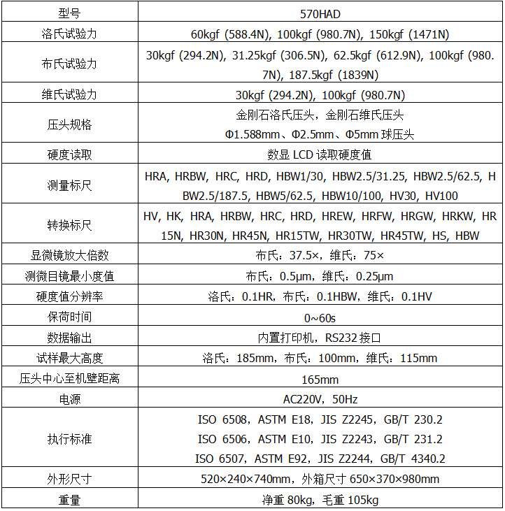570HAD數顯布洛維硬度計外形新穎、功能齊全、操作方便、顯示清晰直觀、性能穩(wěn)定,是集光機電于一體的高新技術產品,可進行布氏、洛氏、維氏三種試驗方法測試,具備了七級試驗力的多功能硬度計,能滿足多種硬度測試需求。手動加載初試驗力后,總試驗力的加荷、保荷、卸荷自動完成,操作簡便迅速�?娠@示和設置當前測試標尺、試驗力、測試壓頭、保荷時間、硬度轉換值、壓頭類型等,其主要功能如下:布氏、洛氏、維氏硬度的三種試驗方法測試;各硬度標尺之間的換算值;硬度測試結果可保存查看及打印輸出,自動計算最大、最小、平均值;配有RS232接口供用戶連接電腦輸出。