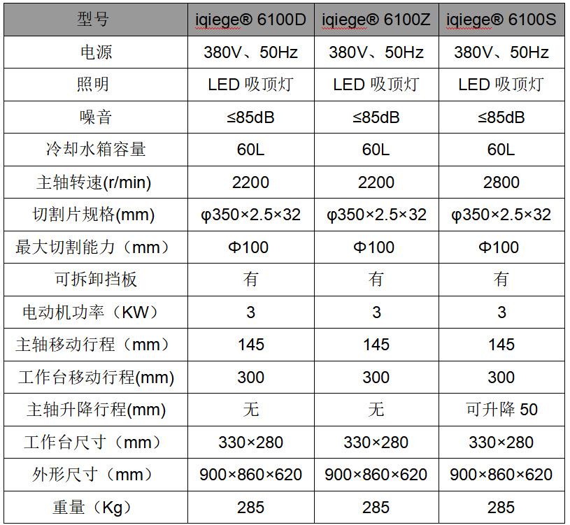 iqiege® 6100系列手自一體式切割機(jī)是由機(jī)身、電控箱、切割室、電機(jī)、冷卻系統(tǒng)、切割砂輪片等部件組成。本系列切割機(jī)不但可以切割直徑為100mm以內(nèi)的圓形工件,還可以切割高70mm、寬100mm以內(nèi)的長(zhǎng)方形試樣。另外,個(gè)別機(jī)型可根據(jù)鋸片消耗量,實(shí)時(shí)調(diào)整主軸高度。該系列切割機(jī)通過(guò)冷卻系統(tǒng)對(duì)試樣進(jìn)行冷卻,以防止試樣在切割過(guò)程中過(guò)熱而燒壞組織。可以切割試樣選擇3種不同的切割模式,并能對(duì)切割進(jìn)給速度和切割行程進(jìn)行設(shè)定,從而提高了切割試樣的質(zhì)量。該系列切割機(jī)分手動(dòng)切割和自動(dòng)切割。并具有安全保護(hù)和運(yùn)行提示功能,更便于人機(jī)的對(duì)話。大容積的切割室,更便于切割者使用,是大專(zhuān)院校、工廠企業(yè)金相試驗(yàn)必備的取樣設(shè)備之一。